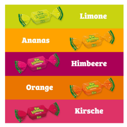 - Skład: Cukier, syrop glukozowy, kwas cytrynowy, barwniki, aromaty naturalne i identyczne z naturalnymi. Smaki owocowe i mleczne. Może zawierać mleko i soję.